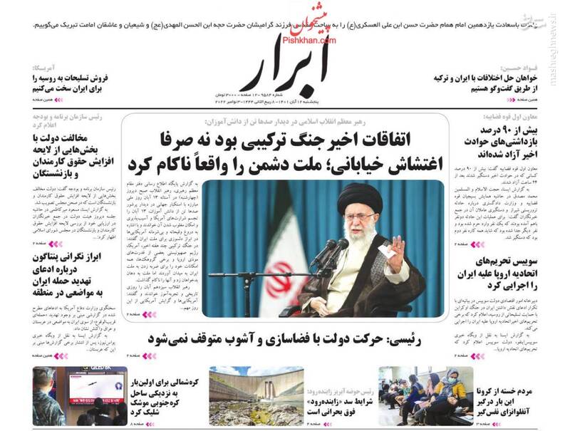 جنایتکاران بدون تردید مجازات میشوند، سرمایهگذاری 40 میلیارد دلاری نفتی، ملت دشمن را ناکام گذاشت، از جمله تیترهای برگزیده روزنامههای پنجشنبه دوازدهم آبان است.