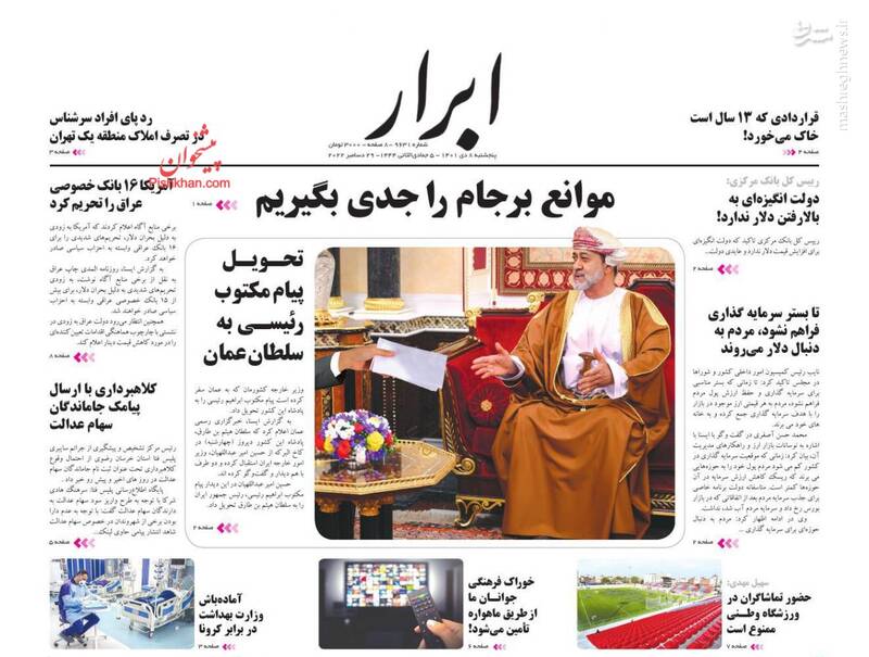 بازار ارز مهارشدنی است سران قوا تصمیمات فوری بگیرند، راه بازسازی، این قاب ماندگارانقلاب ما، بهار بورس، از جمله تیترهای روزنامهها در روز پنجشنبه هشتم دی ماه است.