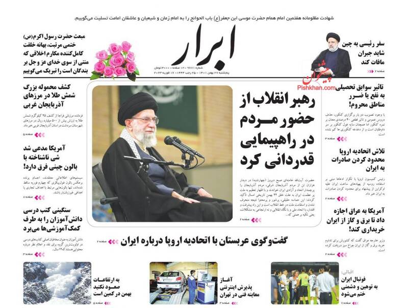 مقابل ملت ایران اظهار تعظیم میکنم، شنبه تاریخی ملت، نشست مدیران شرکتهای تجاری چین با رئیسجمهور ایران، طرح مولدسازی و چالش زمین، تیتر برخی روزنامههای پنجشنبه ۲۷ بهمن ماه ۱۴۰۱ است