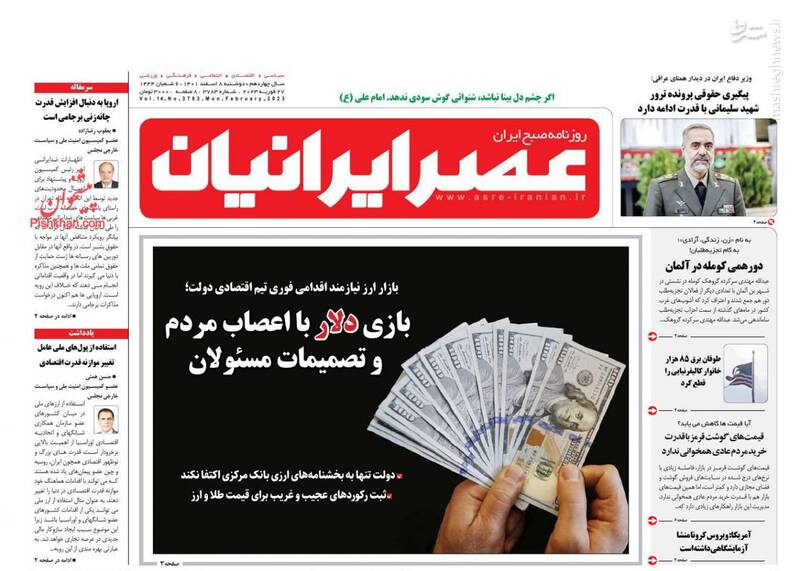 ۳ سناریو حفاظت از مردم برابر سیل دلار، آغاز ریزش قیمت دلار بازار ارز مناسب سرمایه‌گذاری نیست، درس‌های یک‌سالگی جنگ اوکراین، تیتر برخی روزنامه‌های دوشنبه ۸ اسفند است.