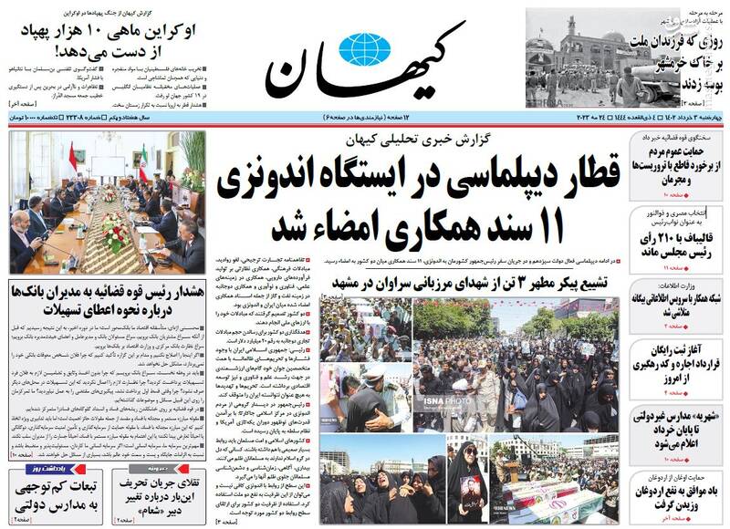 قطار دیپلماسی در ایستگاه اندونزی؛ ۱۱ سند همکاری امضاء شد، آخرین اجلاسیه مجلس انقلابی، گردش ۴۰ هزار میلیاردی سفر در ۲ ماه اول، تیترهای برگزیده روزنامه های چهارشنبه سوم خرداد ۱۴۰۲ است.