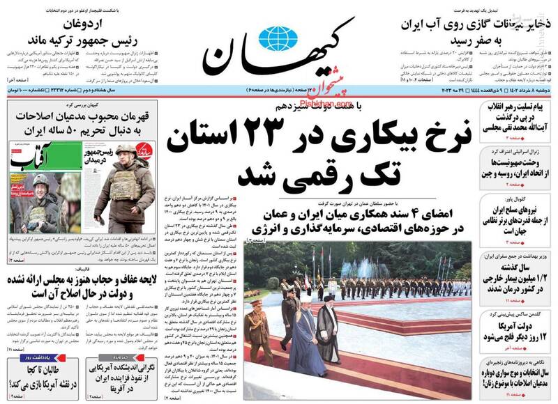 سلطان میانجی چرا دوباره آمد، آمریکا در صندوق ترکیه نبرد، عمان بالاتر از واسطه و پیامآور، نرخ بیکاری در ۲۳ استان تکرقمی شد، از تیترهای برگزیده روزنامههای دوشنبه ۸ خرداد ۱۴۰۲ است.
