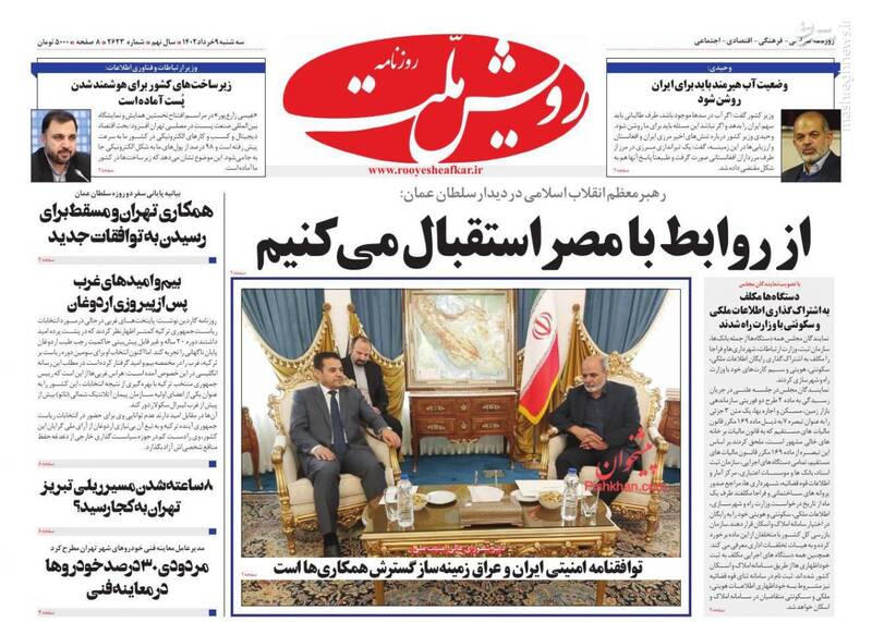 برای از سرگیری رابطه با مصر مشکلی نداریم، دیدار پیام ها، مردم متدین توقع حقی دارند، موشک هایپرسونیک به زودی رونمایی میشود، از تیترهای برگزیده روزنامههای سهشنبه ۹ خرداد ۱۴۰۲ است.