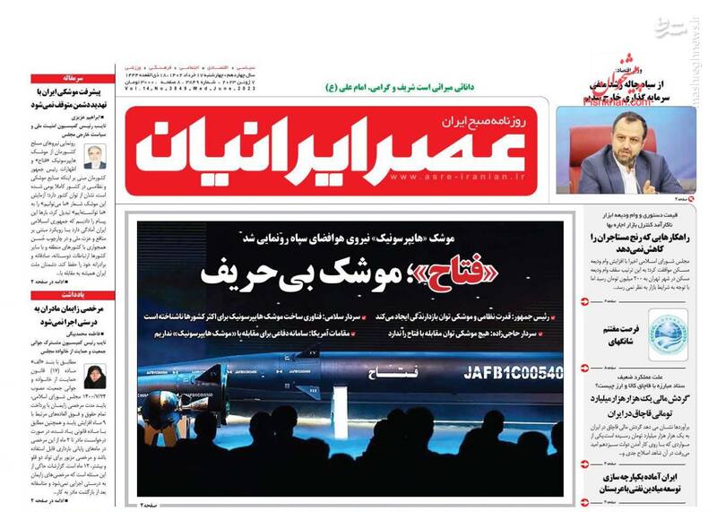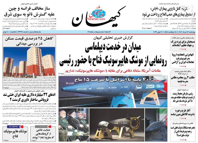 فتح الفتوح فتاح، میدان در خدمت دیپلماسی رونمایی از موشک هایپرسونیک فتاح با حضور رئیسی، سود ۲۰ میلیارد دلاری ایران، از تیترهای برگزیده روزنامههای چهارشنبه ۱۷ خرداد ۱۴۰۲ است.