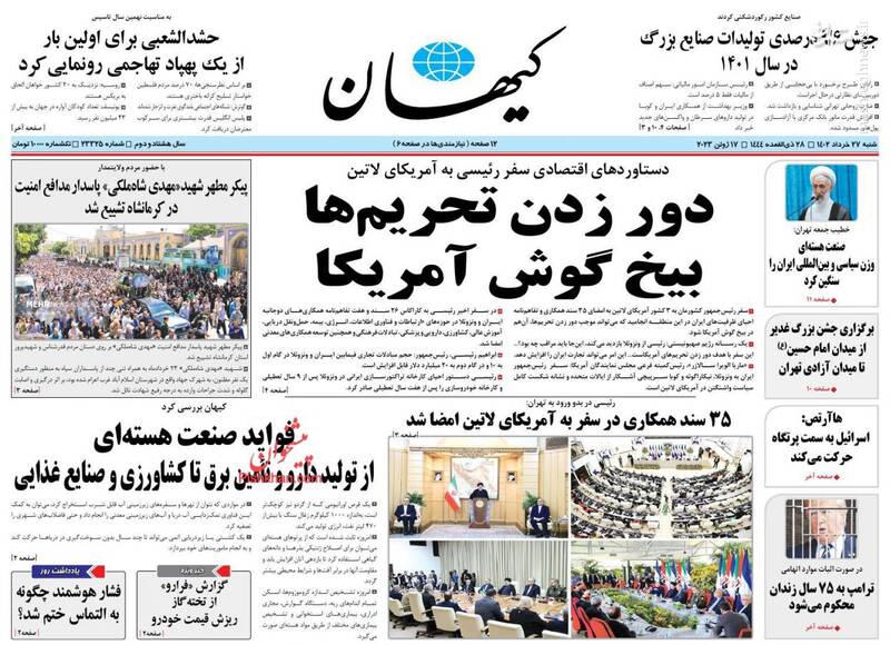 دور زدن تحریمها بیخ گوش آمریکا، باشگاه ضدتحریمی ها، لبنیها از سفره مردم کره میگیرند، راه سوم در حکمرانی اینترنت، از تیترهای برگزیده روزنامههای شنبه ۲۷ خرداد ۱۴۰۲ است.