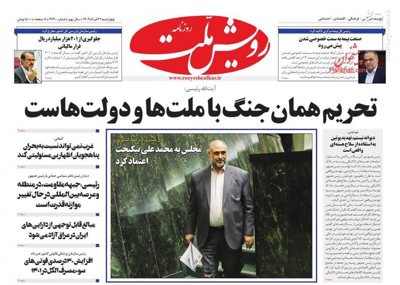 خانه امن منافقین در اروپا فرو ریخت، تغییر موازنه قدرت به نفع محور مقاومت، در دیپلماسی، عزتمندانه برخورد میکنیم اهل التماس نیستیم، از تیترهای برگزیده روزنامههای چهارشنبه ۳۱ خرداد ۱۴۰۲ است.