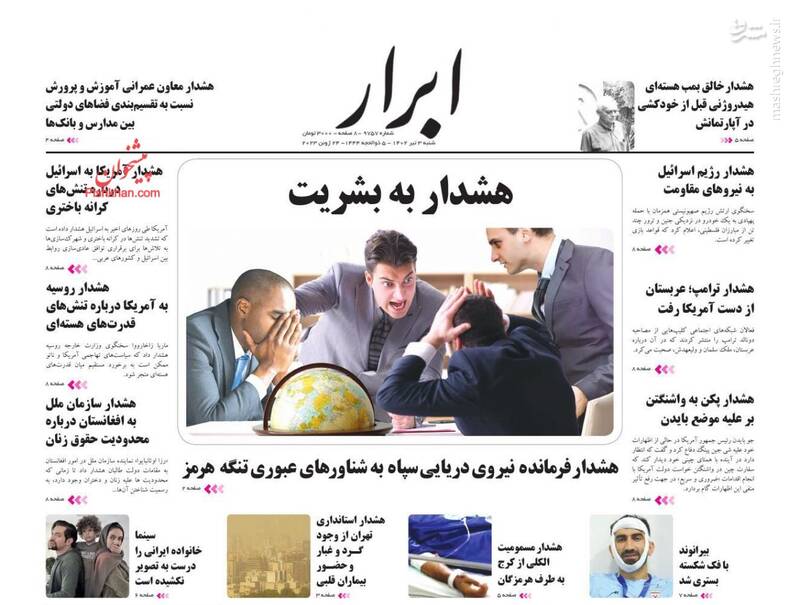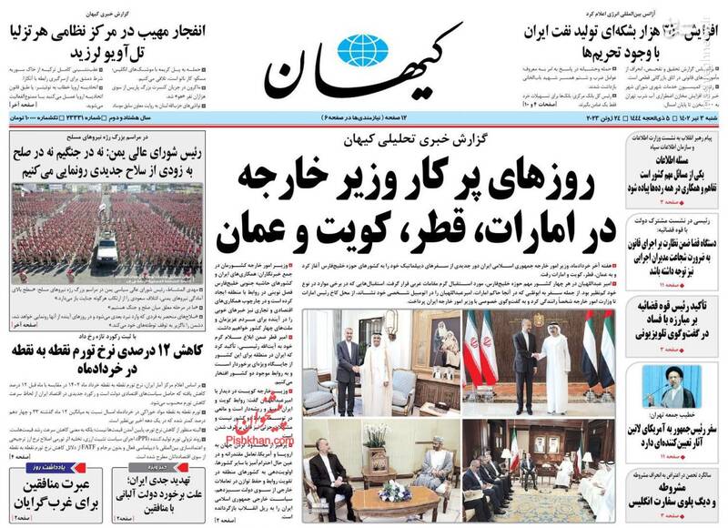 ساحل غربی نتانیاهو را به زانو درخواهد آورد ، اهریمنان در عذاب، ساترا عزیزم دقت کن، روزهای پر کار وزیر خارجه در امارات، قطر، کویت و عمان، از تیترهای برگزیده روزنامههای شنبه ۳ تیرماه ۱۴۰۲ است.