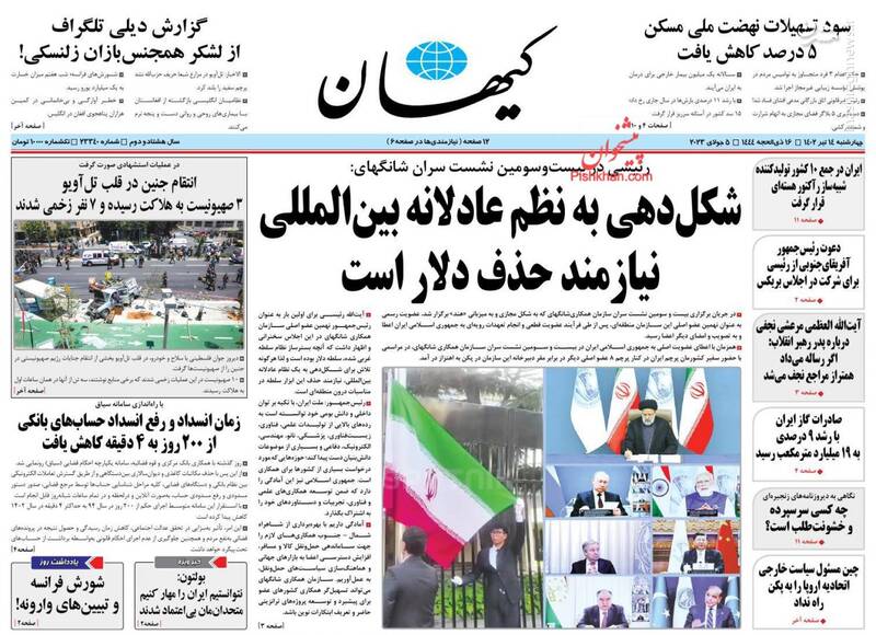 شکلدهی به نظم عادلانه بینالمللی نیازمند حذف دلار است، جهتیابی اقتصادی متناسب با نظم نوین، شانگهای به تهران خوشامد گفت، تیترهای برگزیده روزنامههای چهارشنبه چهاردهم تیرماه ۱۴۰۲ است.