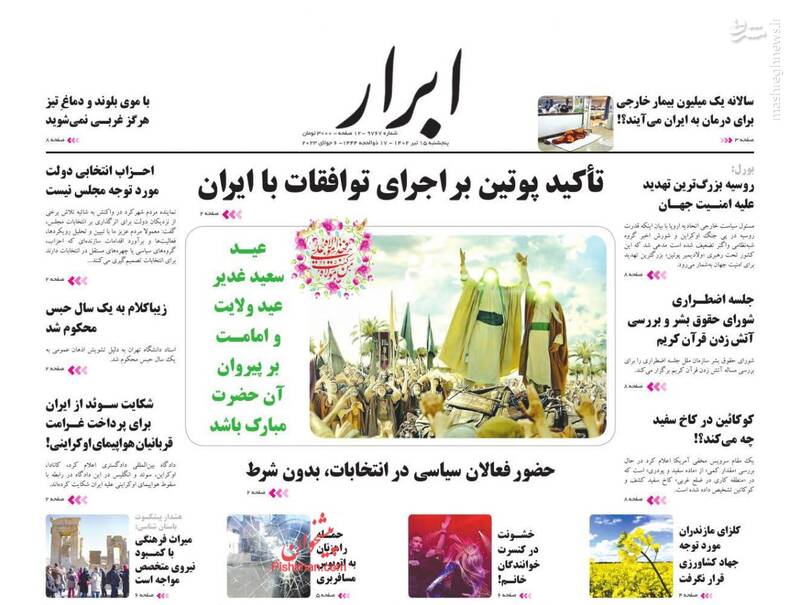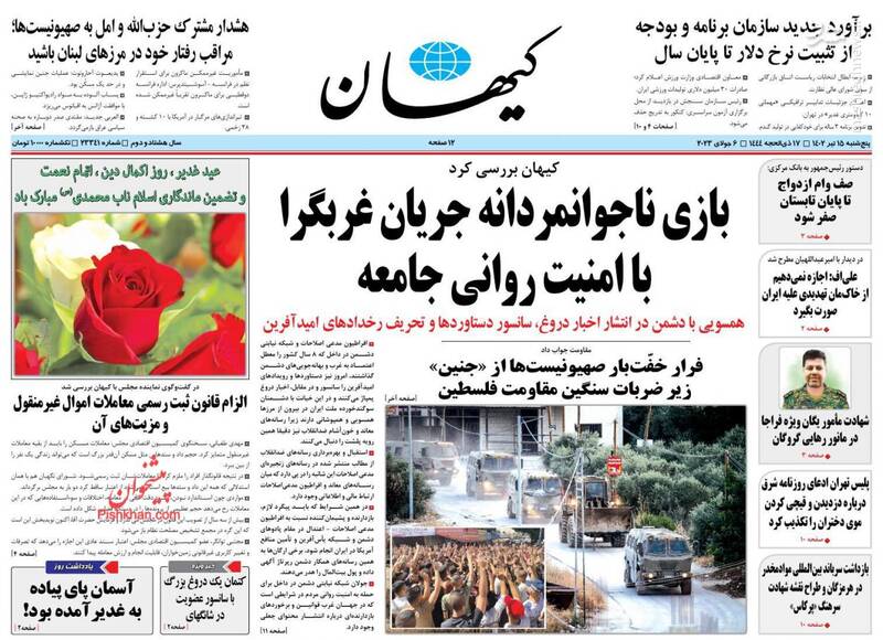 جنین صهیونیستها را فراری داد،تمام دین امیرالمؤمنین است،بازی ناجوانمردانه جریان غربگرا با امنیت روانی جامعه، کاش فرافکنی هم فیلتر بود، تیترهای برگزیده روزنامههای پنجشنبه ۱۵ تیرماه ۱۴۰۲ است.