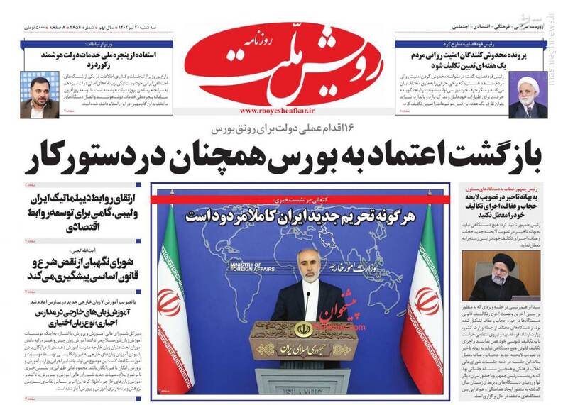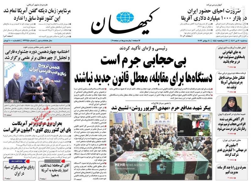 ناتو:تو نه!، بیحجابی جرم است دستگاهها برای مقابله، معطل قانون جدید نباشند، رنج گرانی درعین فراوانی، کمبود دارو درد دیگر هموفیلیها، تیترهای برگزیده روزنامههای سهشنبه ۲۰ تیرماه ۱۴۰۲ است.