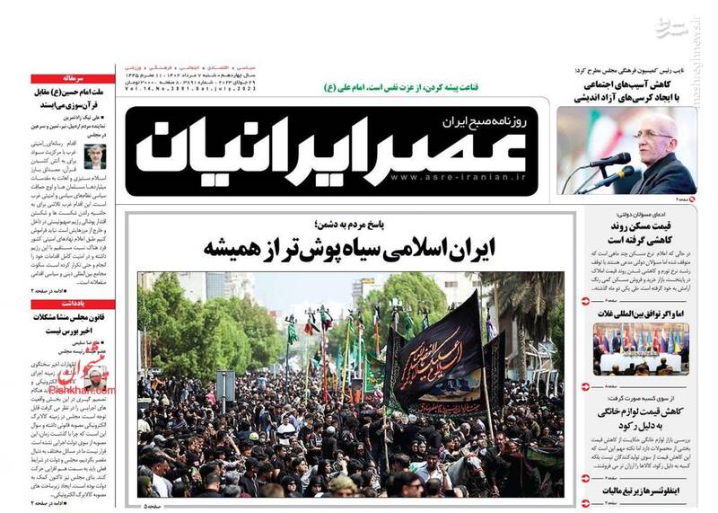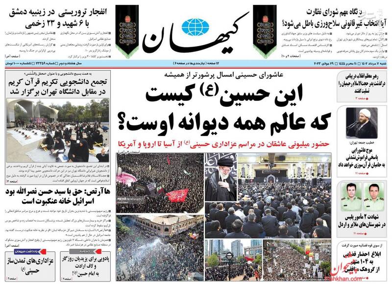 این حسین(ع) کیست که عالم همه دیوانه اوست؟، پیام عاشورایی به دینستیزان، حسینیهای به نام ایران، تیترهای برگزیده روزنامههای شنبه ۷ مرداد ۱۴۰۲ است.