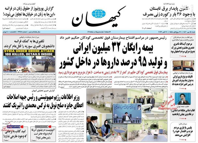 بیمه رایگان ۳۲ میلیون ایرانی، پل دیپلماتیک، نوبل وقاحت، بلای ترافیک، علیه ملت برای نوبل، تیتر برخی روزنامه های شنبه ۱۵ مهرماه است.