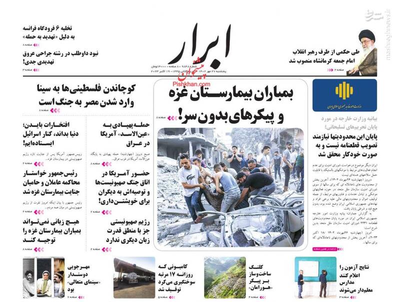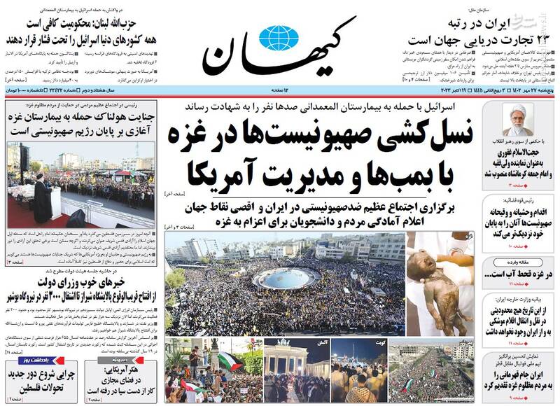 خون جهان از جنایت قرن به جوش آمد، نسلکشی صهیونیستها در غزه با بمبها و مدیریت آمریکا، ایران در کنار غزه مظلوم، تیتر برخی روزنامههای پنجشنبه ۲۷ مهر ماه ۱۴۰۲ است.