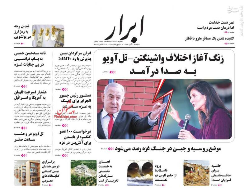 نسل Z فلسطین علیه ایده دو دولت، عرصه بر اسرائیل تنگ شد فشار از بالا و پایین بدون چانه‌زنی!، گشایش جبهه لبنان و جولان علیه اسرائیل قطعی شد، تیتر برخی روزنامه‌های دوشنبه اول آبان ماه ۱۴۰۲ است.
