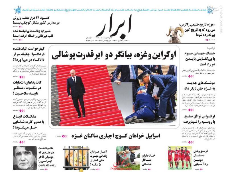 سراب زمان ملل، شکست صهیونیستها در جنگ ترکیبی، نشست ۳+۳ در تهران چه پیامی دارد؟ قدرت نمایی دیپلماتیک ایران، تیتر برخی روزنامههای سهشنبه دوم آبان ماه ۱۴۰۲ است.