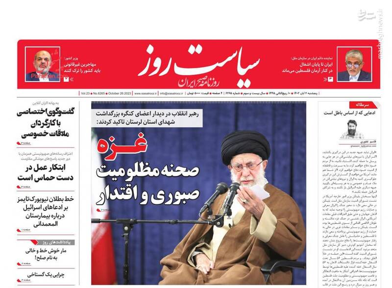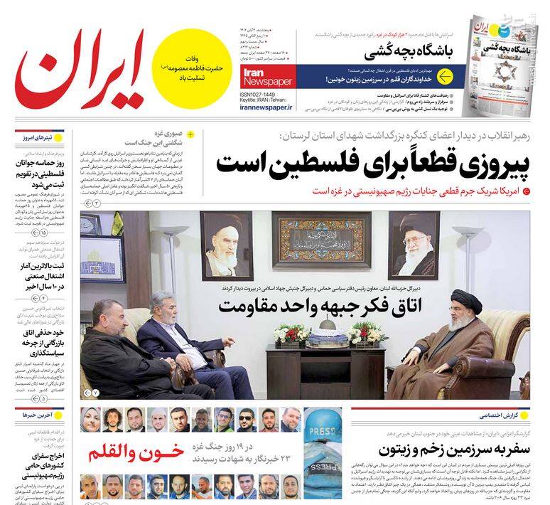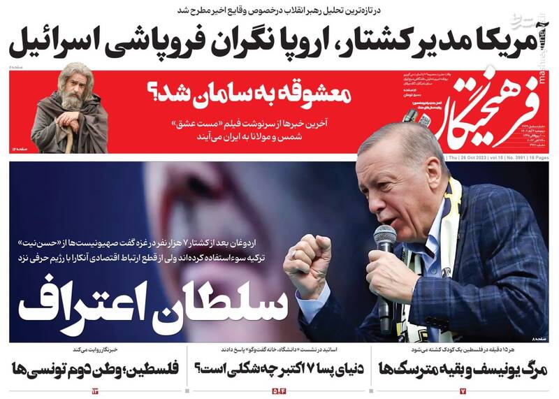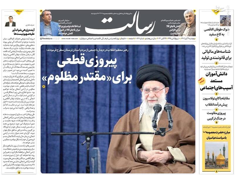 سلطان اعتراف، پیروزی قطعی برای «مقتدر مظلوم»، «غرب وحشی» علیه بشریت، تحقیر تاریخی جبهه شیطان، تیتر برخی روزنامههای پنجشنبه چهارم آبان ماه ۱۴۰۲ است.