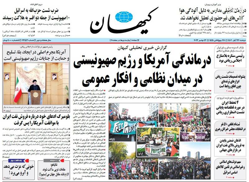 کدام مردم؟، درماندگی آمریکا و رژیم صهیونیستی در میدان نظامی و افکار عمومی، حیفا زیر موشکهای حزبالله، حمایت از مقاومت تنها راه آزادی قدس، تیتر برخی روزنامههای دوشنبه ۲۲ آبان ۱۴۰۲ است .