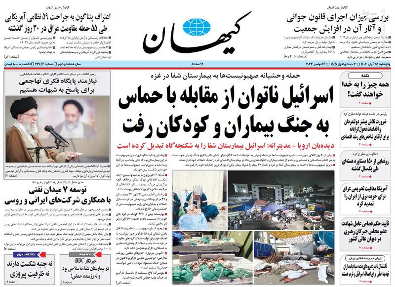 حمله هیتلرها به بیمارستان، اسرائیل ناتوان از مقابله با حماس به جنگ بیماران و کودکان رفت، پایگاه حماس در «شفا» پیدا نشد و... تیتر برخی روزنامههای پنجشنبه ۲۵ آبان ۱۴۰۲ است.