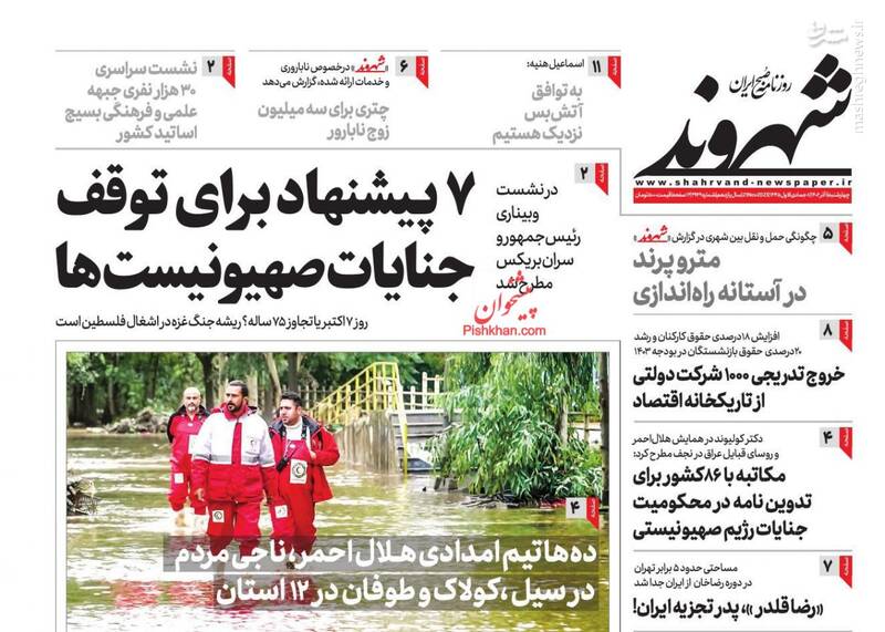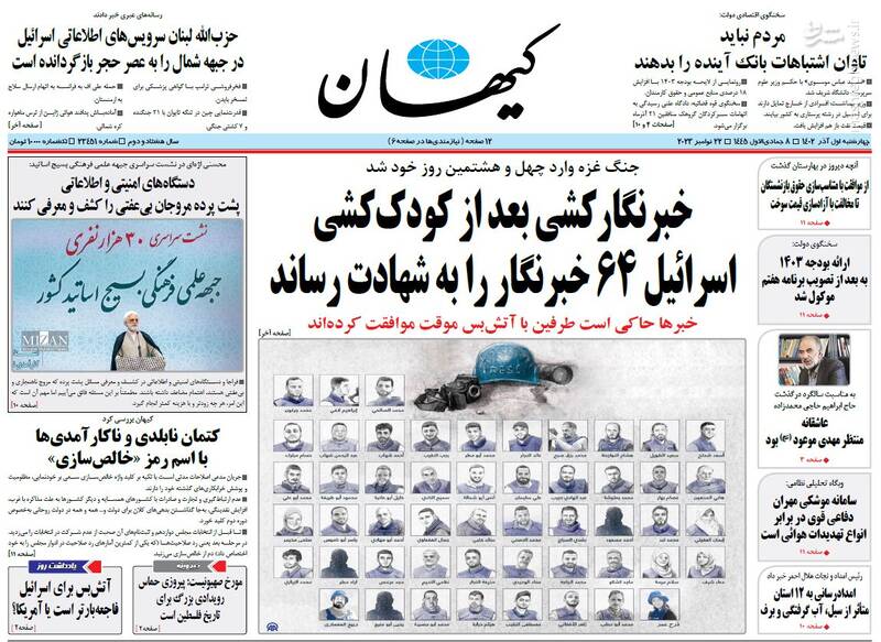 زندگی دائم صهیونیست ها با آتش، تسلیم تلآویو به آتشبس زیر آتش مقاومت، خبرنگارکشی بعد از کودککشی اسرائیل؛ ۶۴ خبرنگار را به شهادت رساند، تیتر برخی روزنامههای چهارشنبه اول آذر ۱۴۰۲ است.