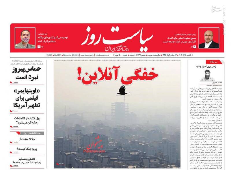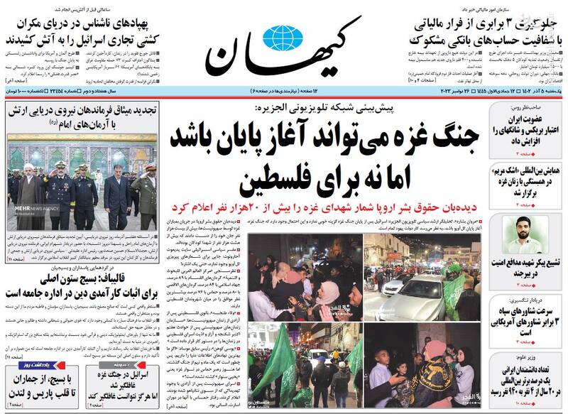 جلادی که موساد ساخت، جنگ غزه میتواند آغاز پایان باشد اما نه برای فلسطین، گلوگاه دریایی اسرائیل زیر پای ارتش یمن، تیتر برخی روزنامههای یکشنبه پنجم آذر ۱۴۰۲ است.