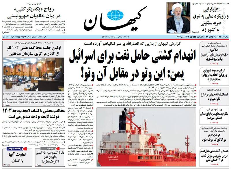 نفس تنگی اسرائیل، انهدام کشتی حامل نفت برای اسرائیل یمن: این وتو در مقابل آن وتو!، بازنشستگی بودجه را بازگرداند، هوای پاک قانونی برای اجرا نکردن!، تیتر برخی روزنامههای چهارشنبه ۲۲ آذر ۱۴۰۲ است.
