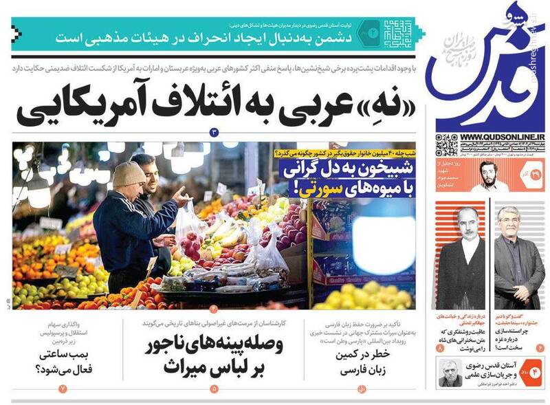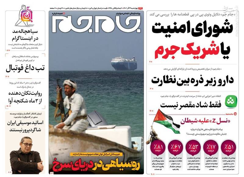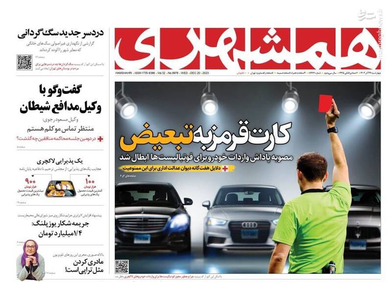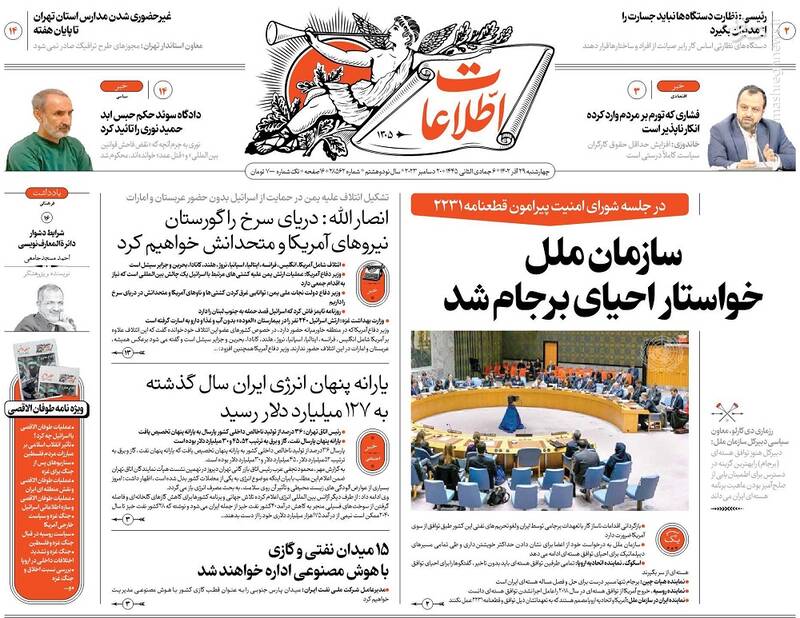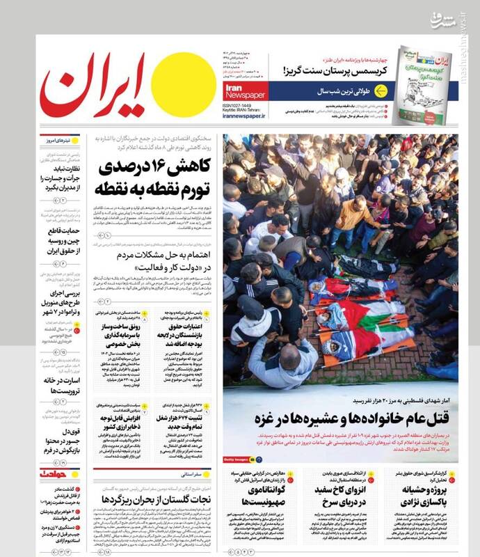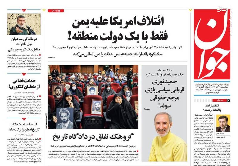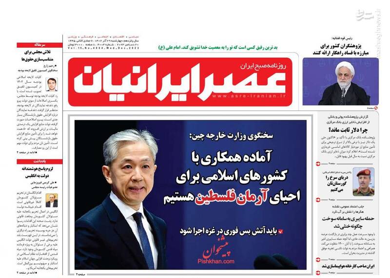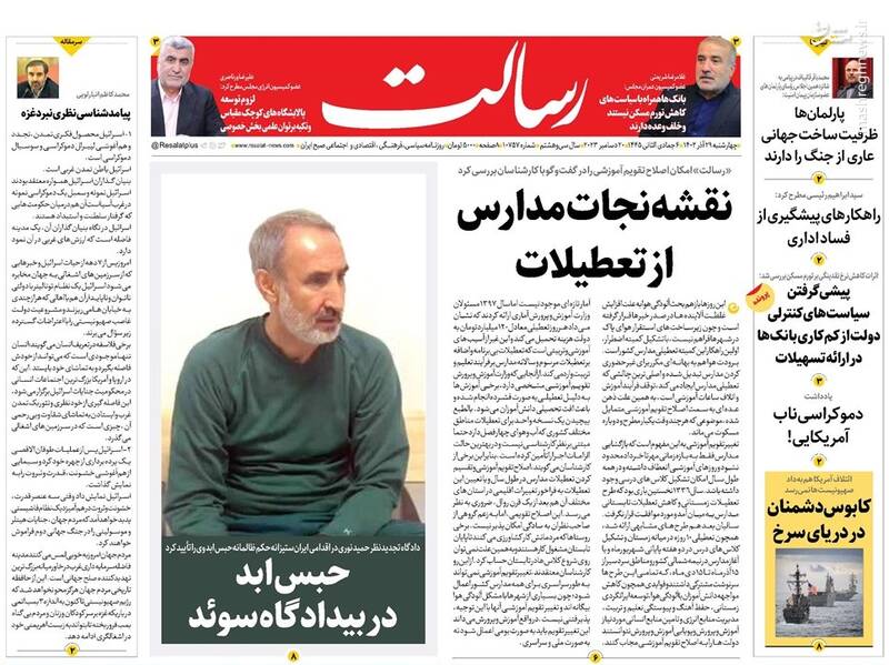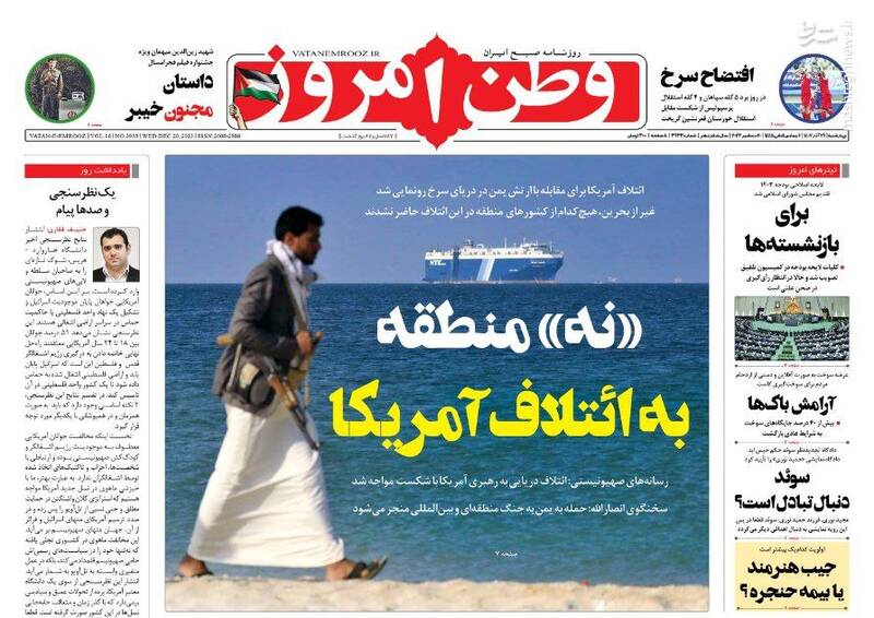 نقشه نجات مدارس از تعطیلات، «نه» منطقه به ائتلاف آمریکا، یمن:دریای سرخ را به گورستان کشتیهایتان تبدیل میکنیم، حمید نوری قربانی سیاسی بازی مرجع حقوقی سوئد!، تیتر برخی روزنامههای چهاشنبه ۲۹ آذر است.