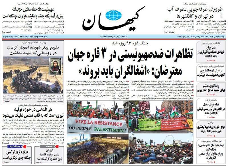 تظاهرات ضدصهیونیستی در ۳ قاره جهان معترضان: «اشغالگران باید بروند»، تهدید ترامپ به شورش، تروریستهای ارزی مشغول خرابکاریاند!، تیتر برخی روزنامههای دوشنبه ۱۸ دی ۱۴۰۲ است.