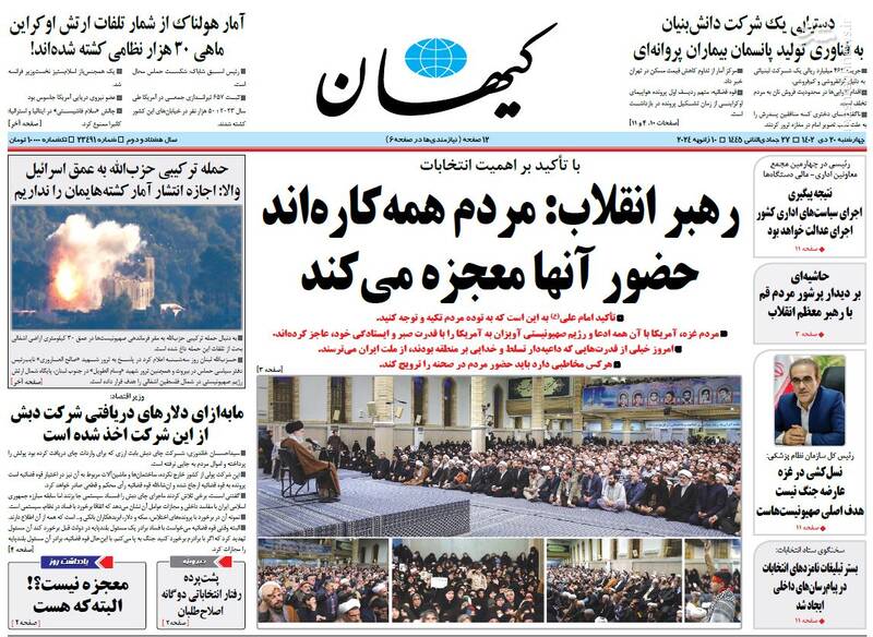 توده مردم همه کارهاند نه نورچشمیها، حمله ترکیبی حزبالله به عمق اسرائیل، مـردم و میـدان، رهبر انقلاب: مردم، همه کارهاند، تیتر برخی روزنامههای چهارشنبه ۲۰ دی ۱۴۰۲ است.
