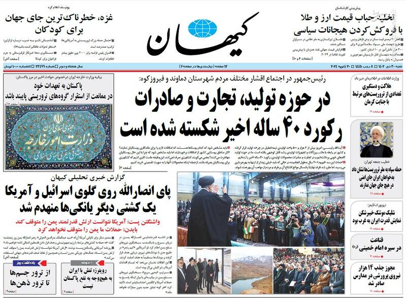 شکار ادامه دارد، در حوزه تولید، تجارت و صادرات رکورد ۴۰ ساله اخیر شکسته شده است، امریکا پاسخ قدرتنمایی یمن را با اتهام تروریسم داد!، تیتر برخی روزنامههای شنبه ۳۰ دی ۱۴۰۲ است.