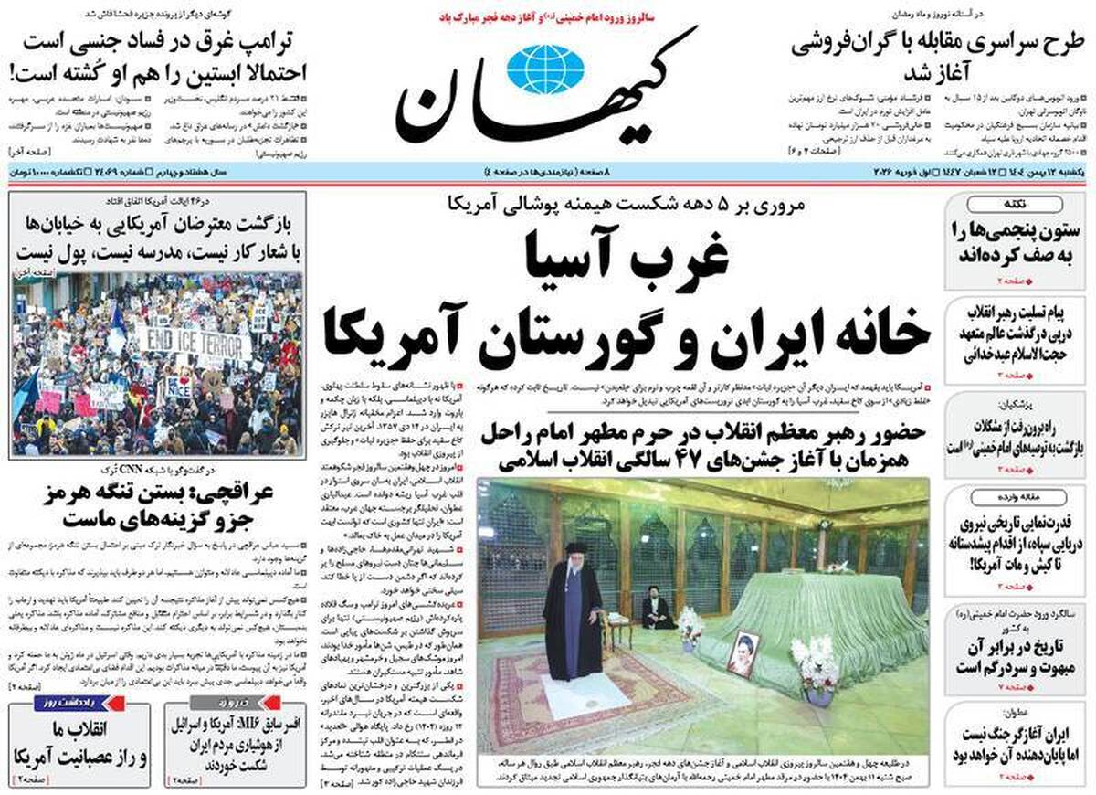 تبیین: غرب آسیا خانه ایران و گورستان آمریکا، بوی تعفن ترامپ، ابهت دفاعی ایران، امام ما، استوار چون انقلاب، ایستاده پای ایران و...از جمله تیترهای روزنامههای یکشنبه ۱۲ بهمن ۱۴۰۴ هستند.
