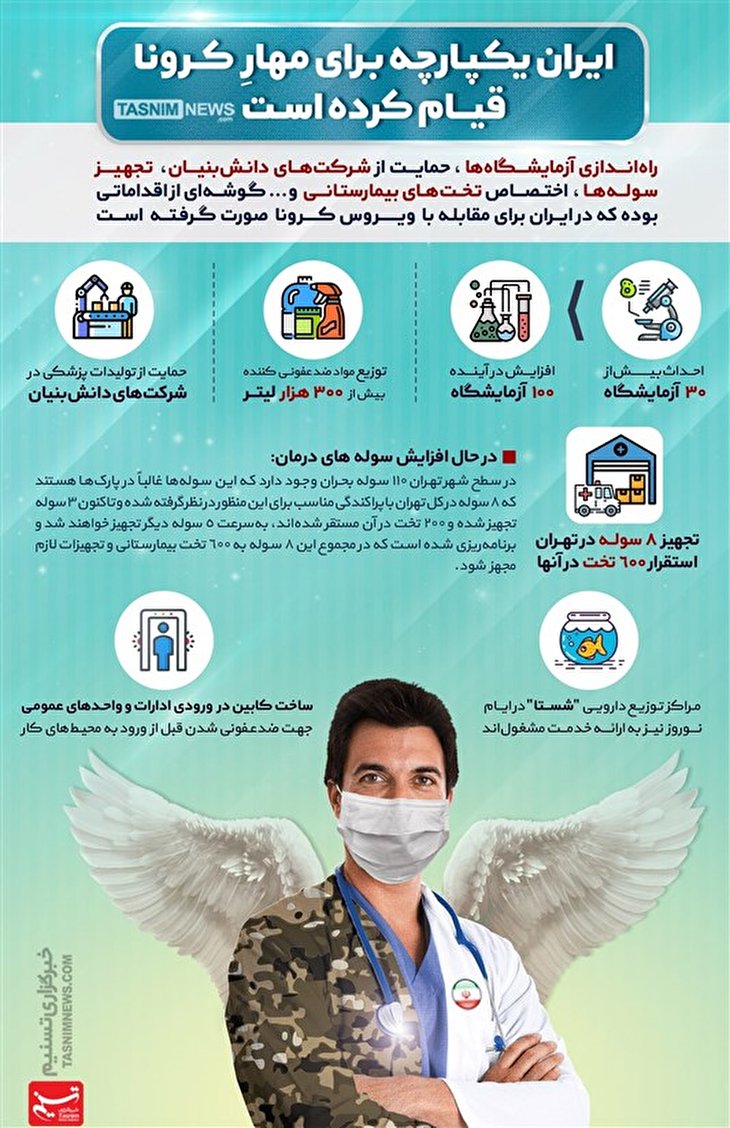 وقتی ایران یکپارچه برای مهار "کرونا" قیام کرده است / راهاندازی آزمایشگاهها، حمایت از شرکتهای دانشبنیان، تجهیز سولهها و اختصاص تختهای بیمارستانی و... گوشهای از اقداماتی بوده که برای مقابله با ویروس کرونا صورت گرفته است.